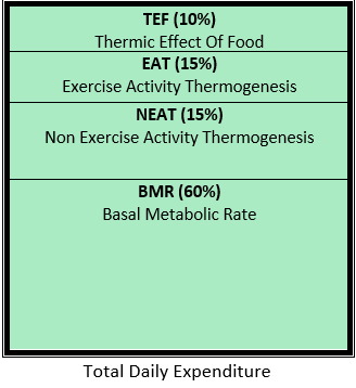 This graph showing the total daily expenditure shows what contributes to your energy output – if you simply increase the exercise(EAT) or become more active in day to day (NEAT) your energy expenditure will go up and you will break your plateau.